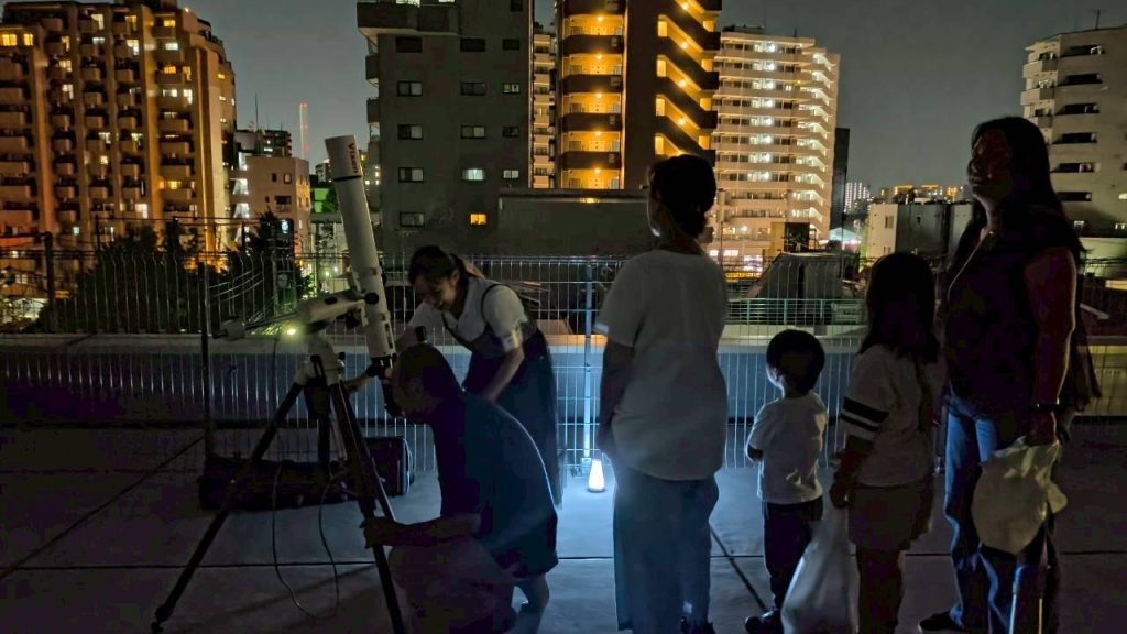 そして、何といっても屋上での観望会です。昨年は雨天だったため開催できなかった観望会でしたが、今年は晴天!望遠鏡を覗き込んだ参加者からは、たくさんの歓声が上がりました。