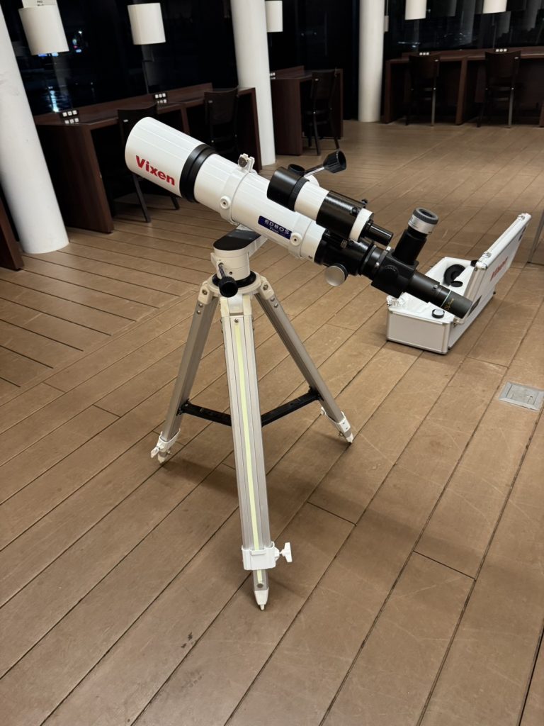 雨は一時的に止むこともありましたが、観望会ができるような天気ではありませんでしたが、一瞬雲間から夏の大三角の星たちが見えました。残念ながら星を見ることはできませんでしたが、準備した天体望遠鏡で模擬天体(土星)を導入し、公園にいらした方々に望遠鏡体験をしていただきました。