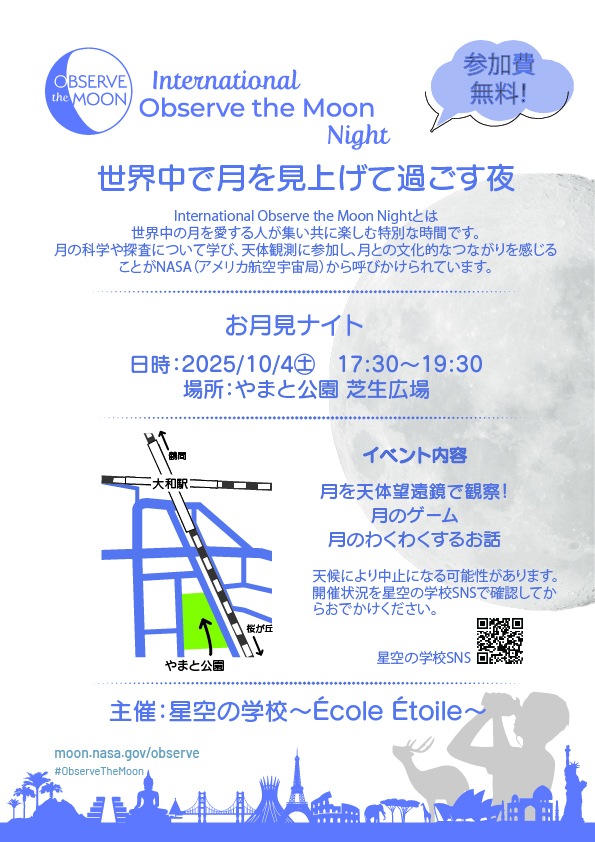 「世界中の月を愛する人が集い、月を観察し、月の科学や探査について学び、、月の文化的つながりを感じる日」として、NASA(アメリカ航空宇宙局)が呼びかけている日です。今年は10/4です。