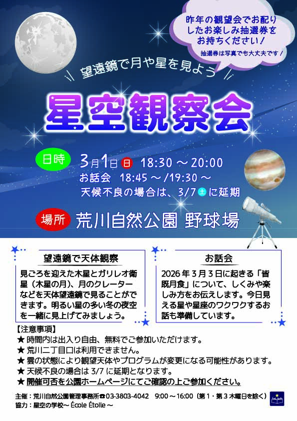 日時:2026/3/1㊐ 18:30~20:00 星のお話 18:45 ~/19:30 ~