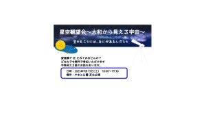 - 9/13㊏ やまと公園で星空観望会を開催今回は、はじめての会場となる「やまと公園」での星空観望会です。芝生が広がり、空もとても開けている観望会にはとて… 続きを読む: 9/13㊏ やまと公園で星空観望会を開催