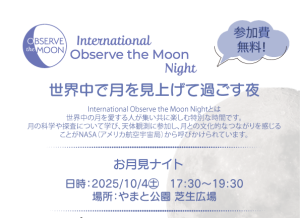- 中止となりました//10/4 ㊏ お月見ナイト@やまと公園10/4は、nasaが提唱するInternational Observe the Moon Night(国際お… 続きを読む: 中止となりました//10/4 ㊏ お月見ナイト@やまと公園
